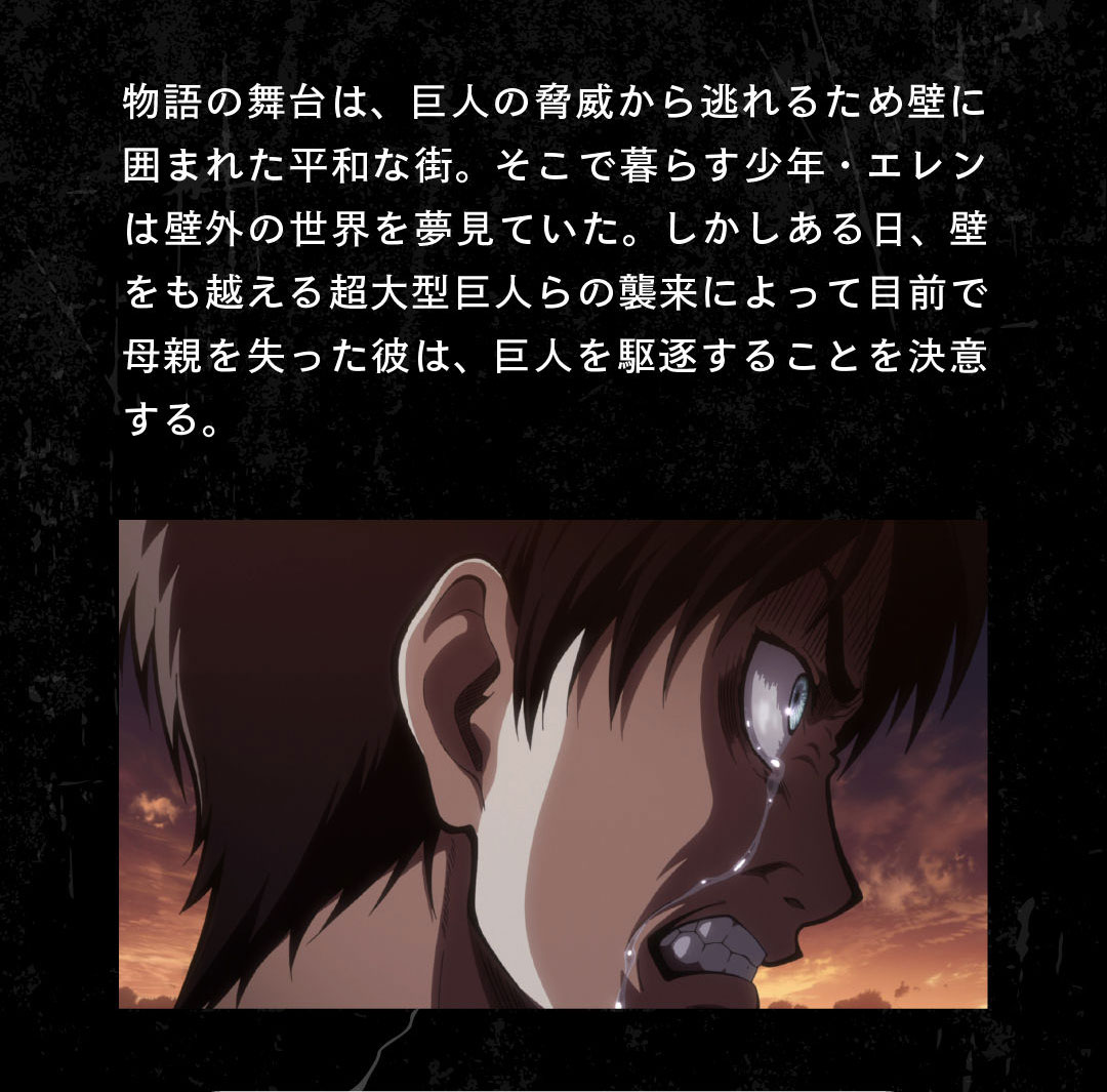 現時点で全70話以上に及ぶ大作になっている「進撃の巨人」だが、驚きに満ちた物語と大迫力のアクションは今からでも観る価値充分。初めて観るという初心者も途中で止まっているという方も、本特集でこれまでのアウトラインを掴んで最新シーズンを存分に楽しんでほしい。