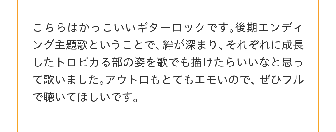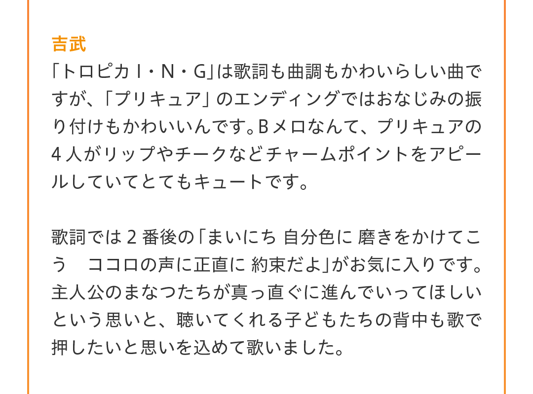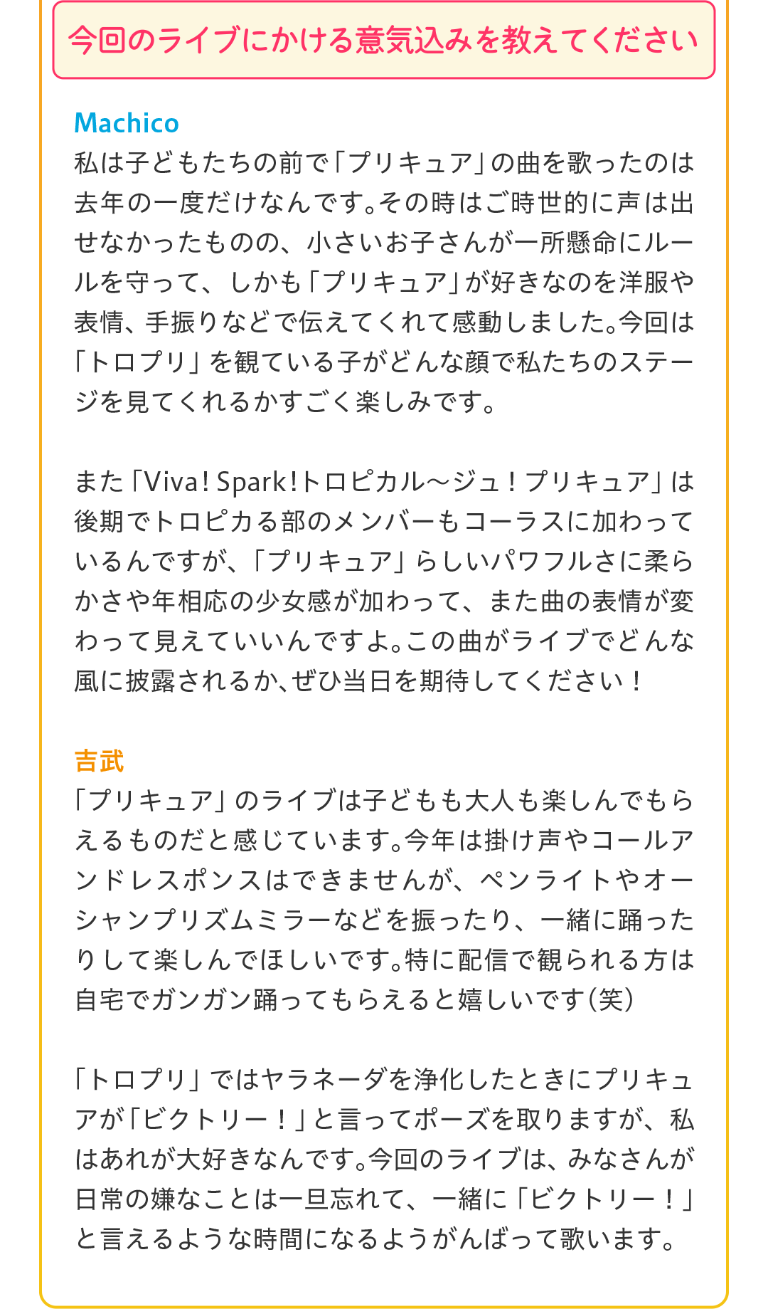 これを記念して、ライブにも出演するオープニング主題歌「Viva! Spark!トロピカル~ジュ!プリキュア」を歌うMachico、前期エンディング主題歌「トロピカ I・N・G」と後期エンディング主題歌「あこがれ Go My Way!!」を歌う吉武千颯(後期は北川理恵とのデュエット) にそれぞれインタビュー。「プリキュア」シリーズへの思い、今回のライブにかける意気込みなどを語ってもらった。