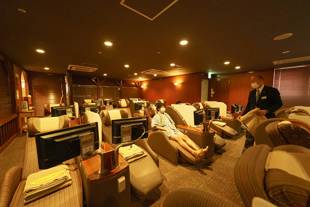 スパ・サウナゾーンでリフレッシュしたあとは、食事やボディケア、日焼けコーナーなど、お楽しみが満載のレストランフロアへ。リラックスコーナーのシートは旅の疲れも忘れられる快適さで、サウナとこのフロアを往復して丸一日滞在する人がいるというのもうなずける。