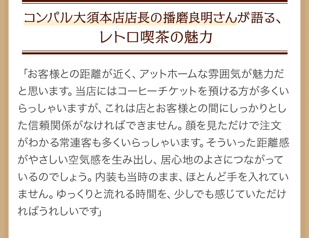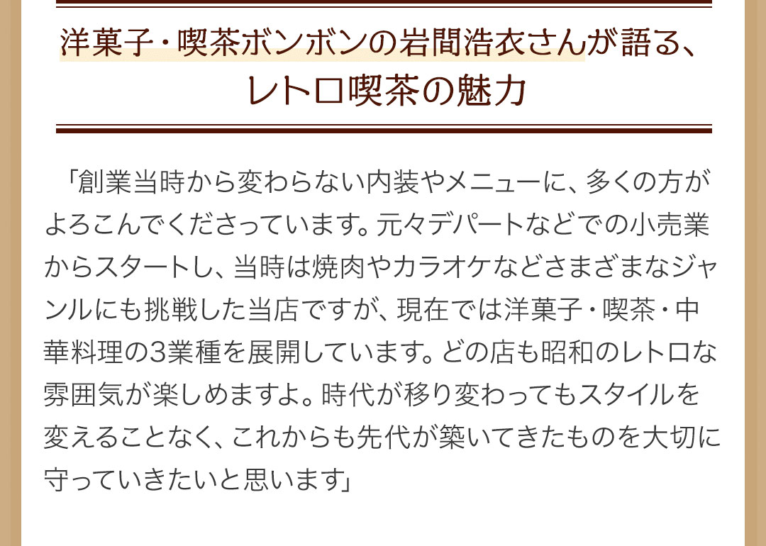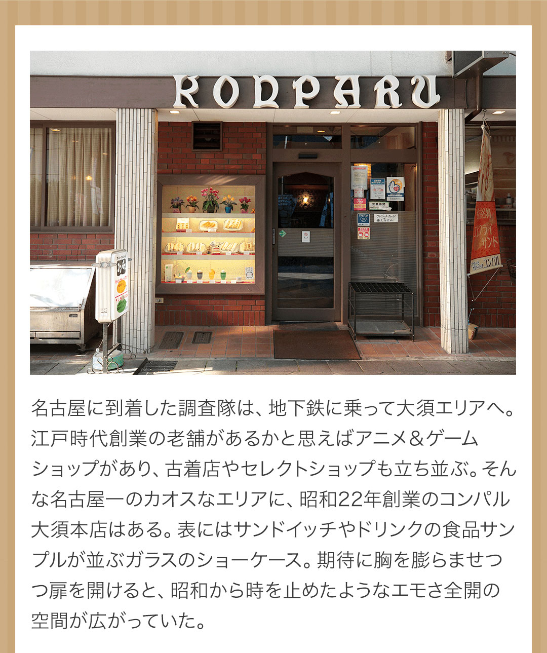 若者たちから火がついた「レトロな純喫茶」ブーム。彼らがこの世に生まれるはるか前の雰囲気がなぜ懐かしまれるのか。その謎と魅力を追求するため、平成生まれの調査隊員が愛知県名古屋市へ! モーニングサービスなど独自の喫茶文化が脈々と受け継がれている名古屋は、全国の喫茶店マニアが憧れるレトロ喫茶の宝庫。今回は名古屋の人気喫茶店である、コンパル大須本店と洋菓子・喫茶ボンボンを訪ねた。